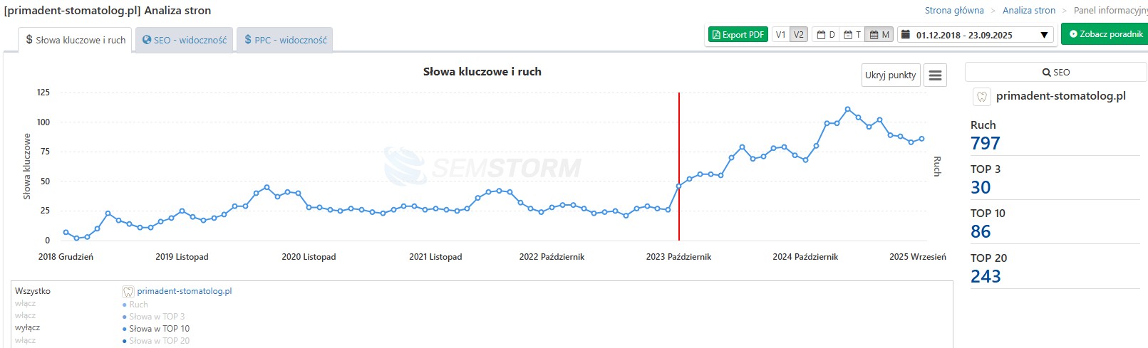 Wzmocniliśmy linkbuilding, a w treściach podkreśliliśmy zakres kompetencji zespołu (endodoncja mikroskopowa, chirurgia/implanty). Dodaliśmy krótkie poradniki („kiedy do endodonty?”, „jak wygląda pierwsza wizyta?”).